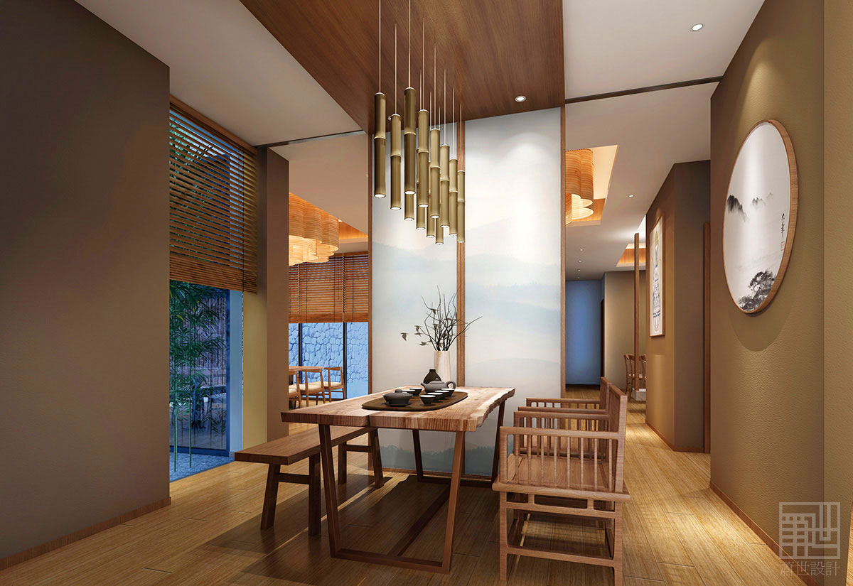 在燈光的使用上,我們只選取了較弱的點光源以及線性的輔助光,通過光線的控制與格擋的使用,營造出幽靜素雅的氛圍,使人沉心靜氣,并能延展無盡猜想。
